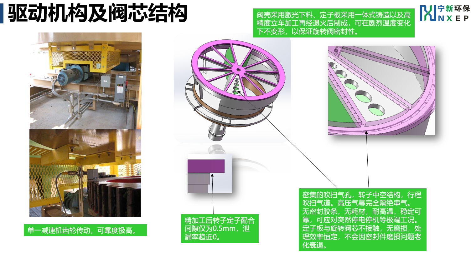 旋转阀结构简单、灵活,维护方便,加工精度高,采用机械硬密封和风刀密封,确保阀门密闭无泄漏;定子和转子之间采用气密封方式,以确保进气腔室与排气腔室之间不会窜气。